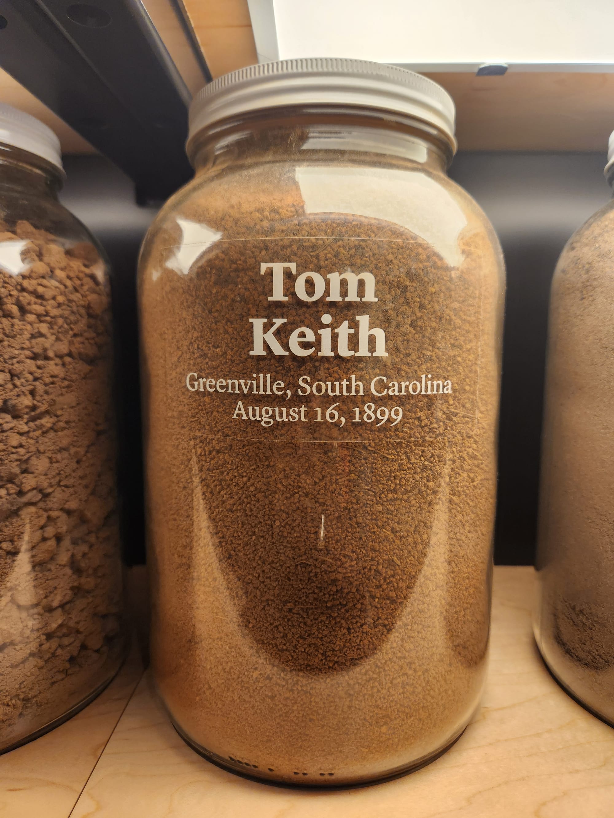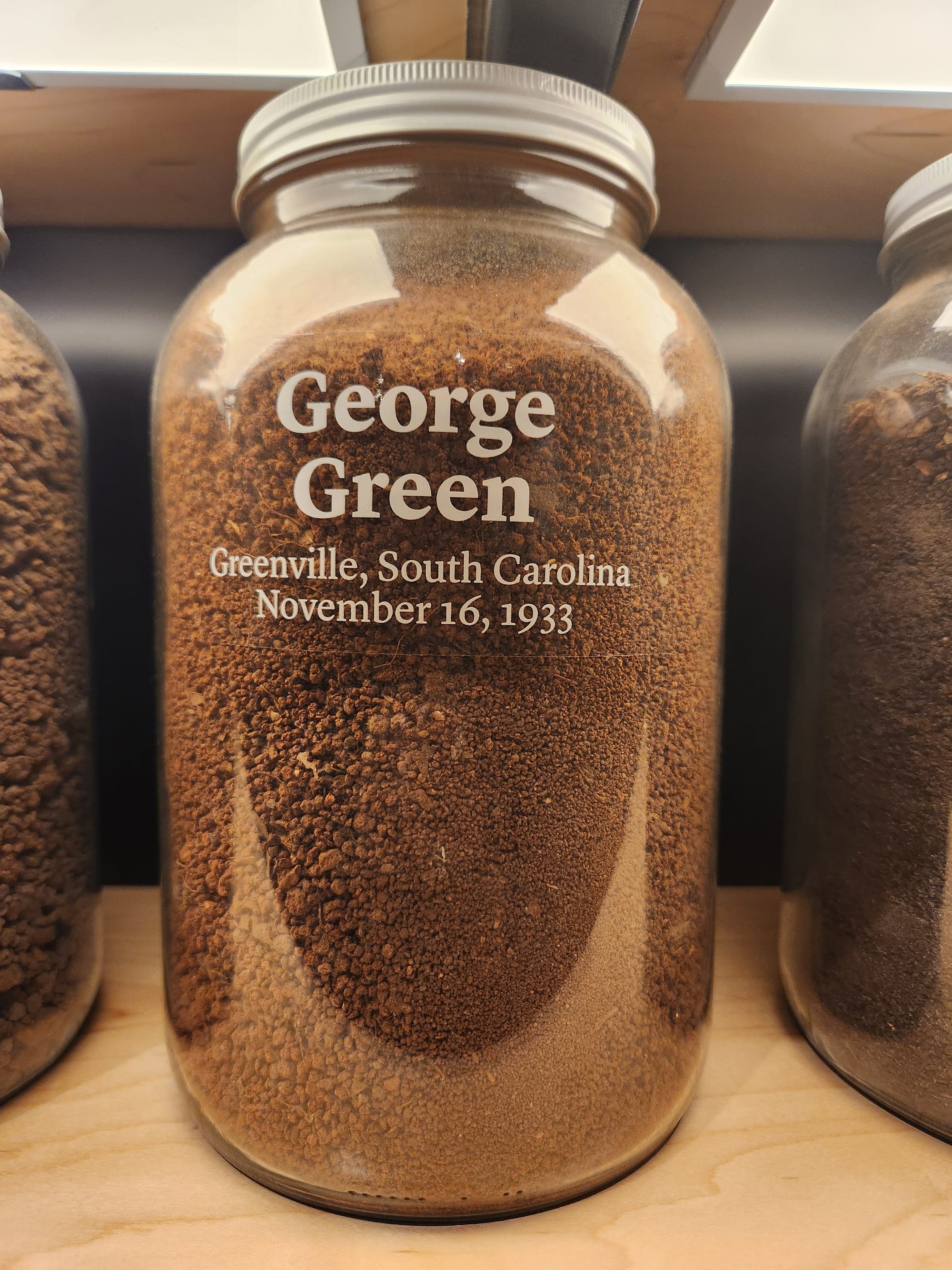 In the Legacy Museum, there is a corresponding display of over 800 of the jars that have been returned to the EJI by local communities. In that display, there is soil from across our country, soil that perhaps still carries the DNA of the victims. Photography is not normally allowed inside the museum. But, during my recent visit, a museum manager generously helped me locate and took a photo for me of two of our county's jars on display there.